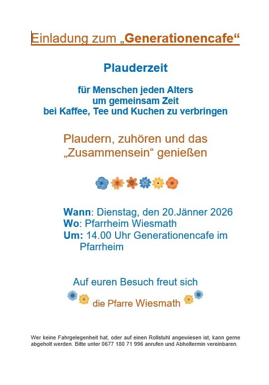 Herzliche Einladung zum Generationencafe am Dienstag, den 20. Jänner 2026 um 14.00 Uhr im Pfarrheim Wiesmath.