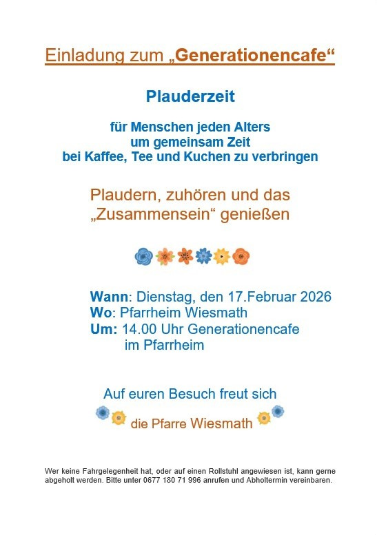 Im Gedenken an unseren Herrn Pfarrer Raimund Beisteiner laden wir herzlich zum Generationencafé am Faschingsdienstag um 14:00 Uhr ins Pfarrheim ein.
